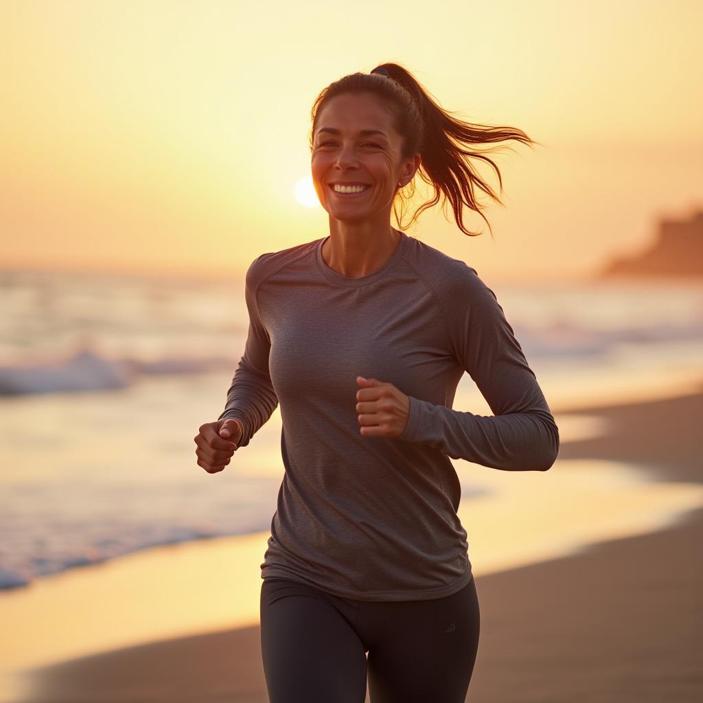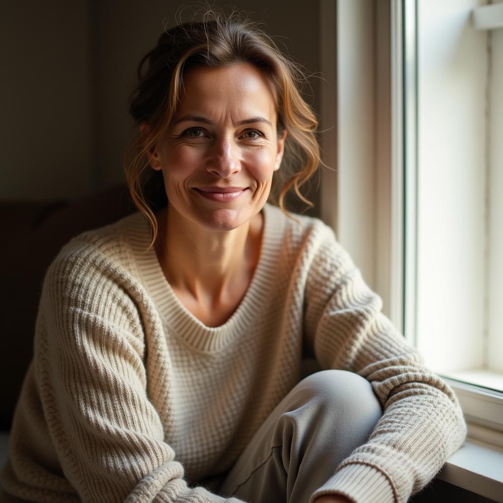A person, smiling and happy, with healthy skin.